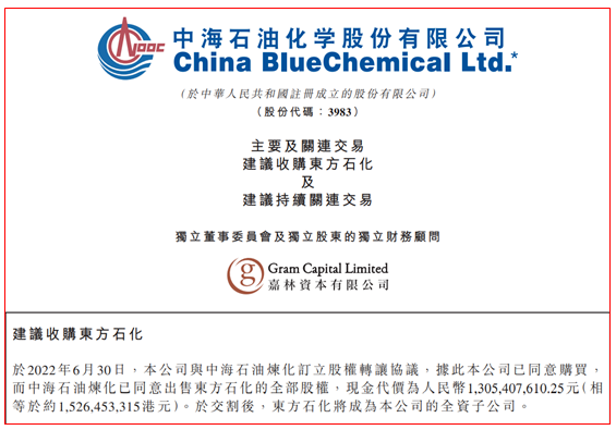 latest news: cnooc petrochemical announced that on june 30, 2022, the company entered into an equity transfer agreement with cnooc refinery, the company has agreed to purchase, and cnooc refinery has agreed to sell for the entire equity interest in orient petrochemical, the cash consideration is rmb 1.305 billion (units are the same below). after the closing, orient petrochemical will become a wholly-owned subsidiary of the company.