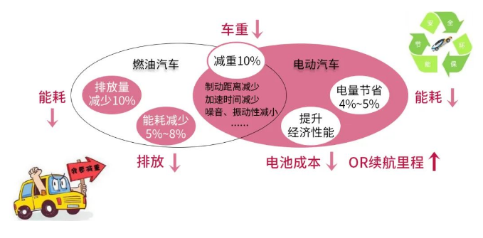according to the law of conservation of energy, the heavier the object, the greater the driving force required, and the corresponding energy consumption is more. it is estimated that for every 10% reduction in the quality of the car itself, the energy consumption of fuel vehicles can be reduced by 5% to 8%, and the emissions can be reduced by 10%; the power consumption of electric vehicles can be reduced by 4% to 5%, and the cruising range can be improved. at the same time, the lighter weight of the car will also bring advantages such as reduced braking distance and acceleration time, and reduced noise and vibration.