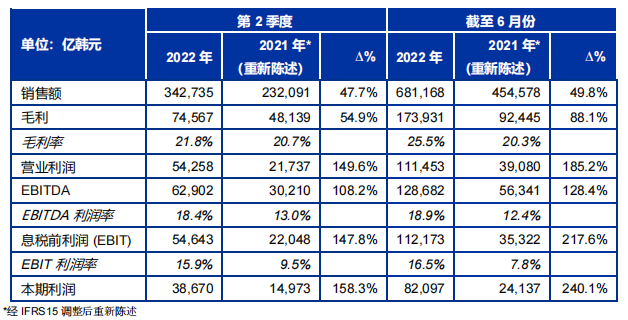sales revenue (krw 454.578 billion) increased by 49.8%. in the first six months of 2022, the group’s gross profit margin reached 25.5%, an increase of 5.2% over the first six months of 2021.