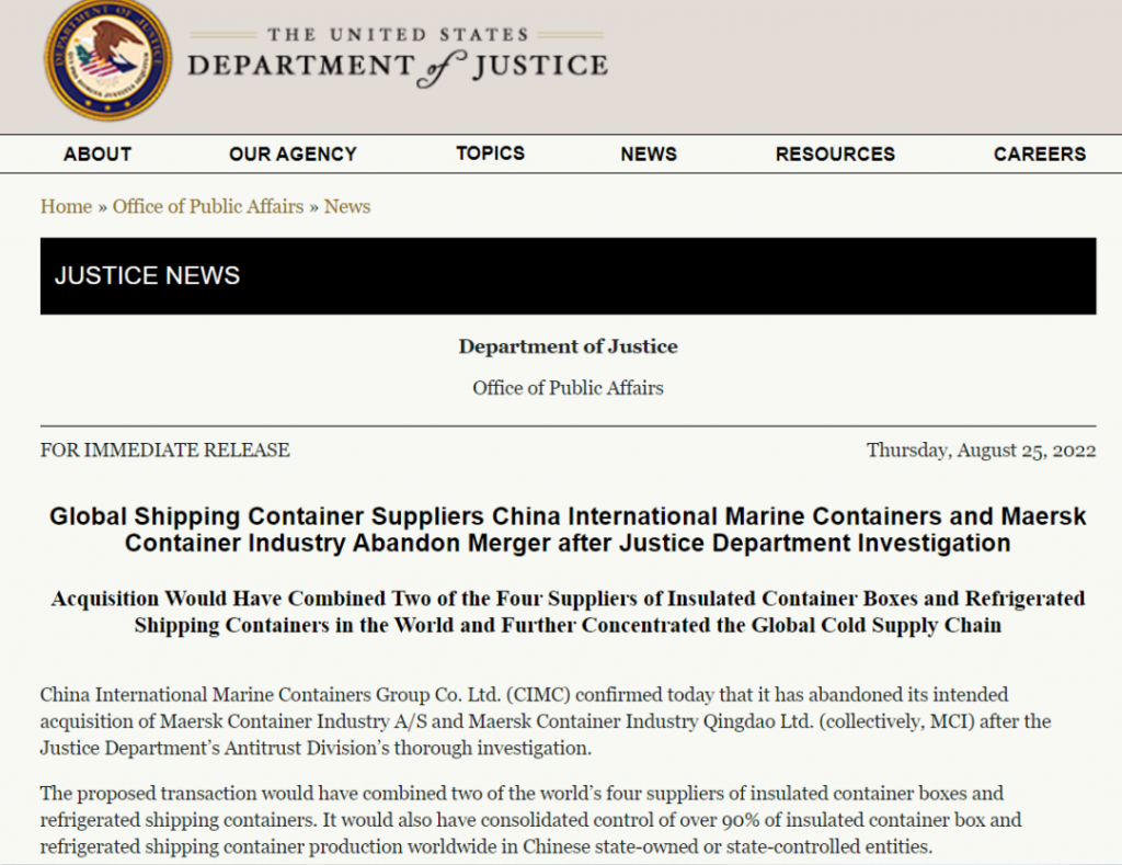 the u.s. department of justice said the proposed deal would amount to a merger of two of the world’s four largest producers of insulated containers/refrigerated containers. meanwhile, if the deal goes through, it means the chinese state-owned company (cimc) will control 90% of the world’s production share of insulated containers/refrigerated containers.