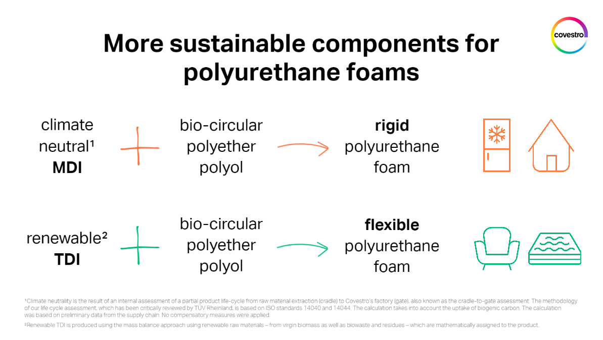 now also offers polyether polyols using bio-recycled raw materials. together with renewable toluene diisocyanate (tdi) and climate neutral methylene diphenyl diisocyanate