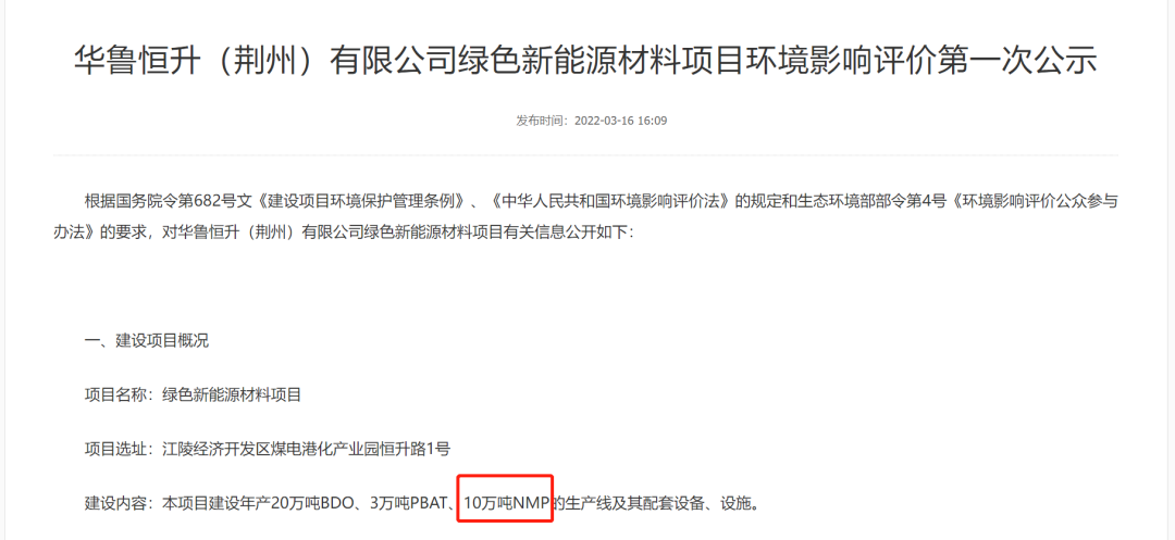 on march 16, the jingzhou municipal bureau of ecology and environment released the first public announcement of the environmental impact assessment of the green new energy material project of hualu hengsheng (jingzhou) co., ltd. this includes 100,000 tons/year of nmp capacity.