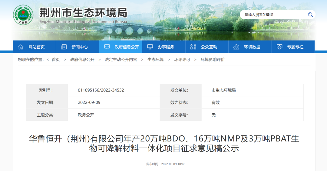 hualu hengsheng (jingzhou) co., ltd. has an annual output of 200,000 tons of bdo, 160,000 tons of nmp and 30,000 tons of pbat biodegradable materials with a total investment of 3,387.12 million yuan. the construction site is located in jiangling economic development zone, jingzhou city, hubei province. the newly acquired land on the north side of the existing factory of hualu hengsheng (jingzhou).