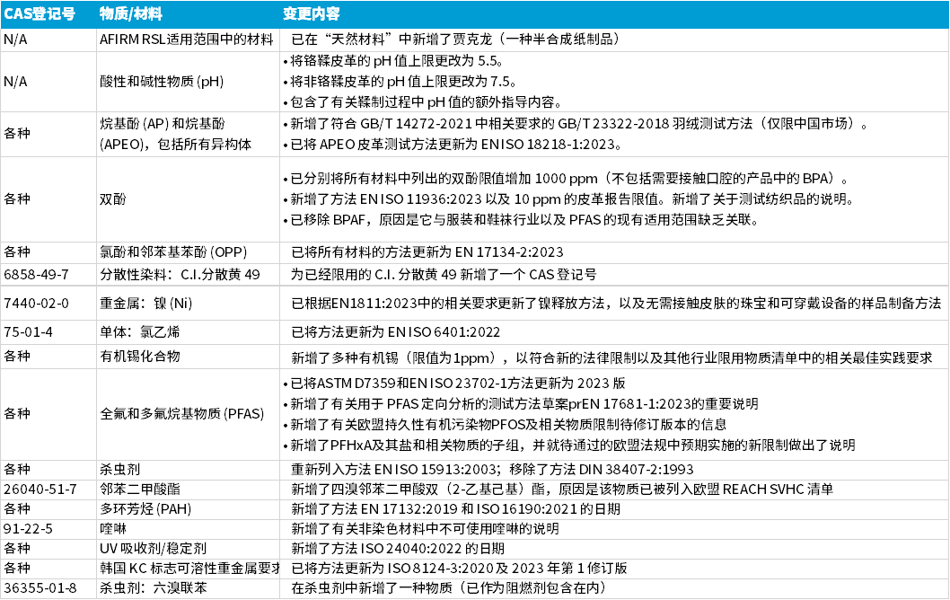in february this year, the apparel and footwear international rsl management working group (afirm) released the 2024 ninth edition of the restricted substances list (rsl) is released, which is usually updated annually. this update mainly adds restrictions on substances such as organotins, bisphenols, and per- and polyfluoroalkyl (pfas). the following are the details of the changes.